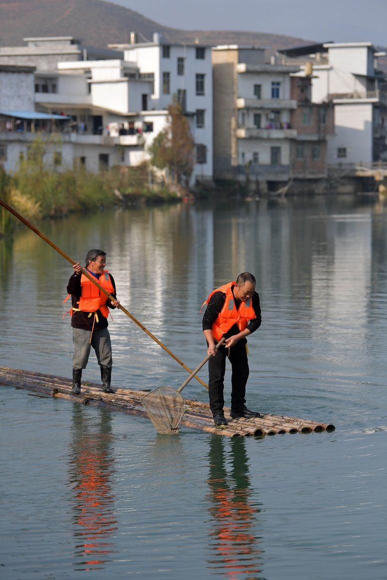 上栗縣東源鄉(xiāng)河道保潔員在打撈垃圾 彭昭之 攝