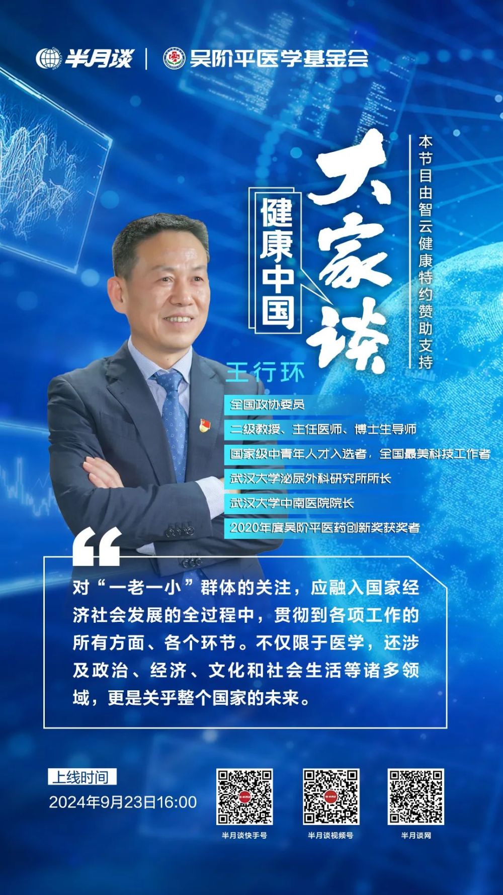 2024年全國(guó)兩會(huì)期間,全國(guó)政協(xié)委員、2020年度吳階平醫(yī)藥創(chuàng)新獎(jiǎng)獲獎(jiǎng)?wù)?、武漢大學(xué)中南醫(yī)院王行環(huán)院長(zhǎng)提出了關(guān)注“一老一小”群體的提案,建議將其融入國(guó)家經(jīng)濟(jì)社會(huì)發(fā)展全過程中,貫徹到各項(xiàng)工作的所有方面、各個(gè)環(huán)節(jié)。即將到來的深度老齡化問題,會(huì)導(dǎo)致多種疾病發(fā)生率的上升;我國(guó)人口已經(jīng)連續(xù)兩年出現(xiàn)負(fù)增長(zhǎng),對(duì)于國(guó)家而言也是前所未有的挑戰(zhàn)?!皩?duì)一老一小的關(guān)注,不光是醫(yī)學(xué)領(lǐng)域的問題,甚至涉及整個(gè)國(guó)家的未來。”