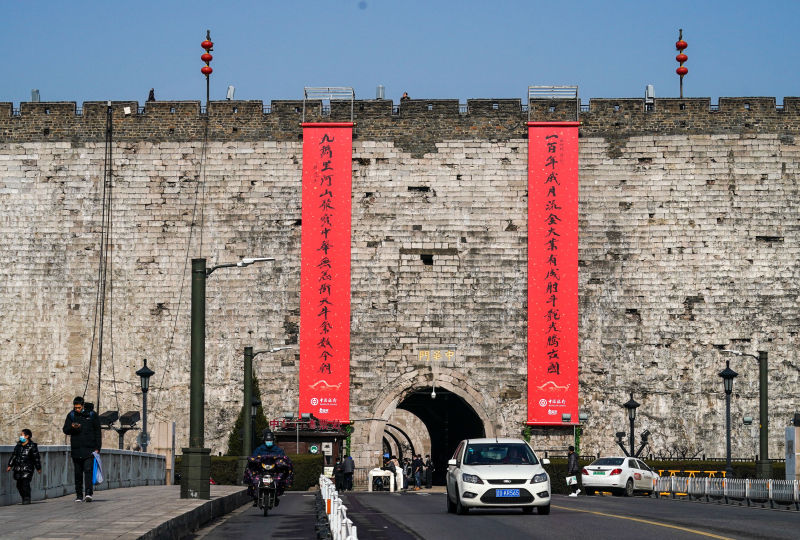 南京市明城墻中華門等12座城門掛上巨幅春聯(lián)迎接春節(jié) 李博 攝