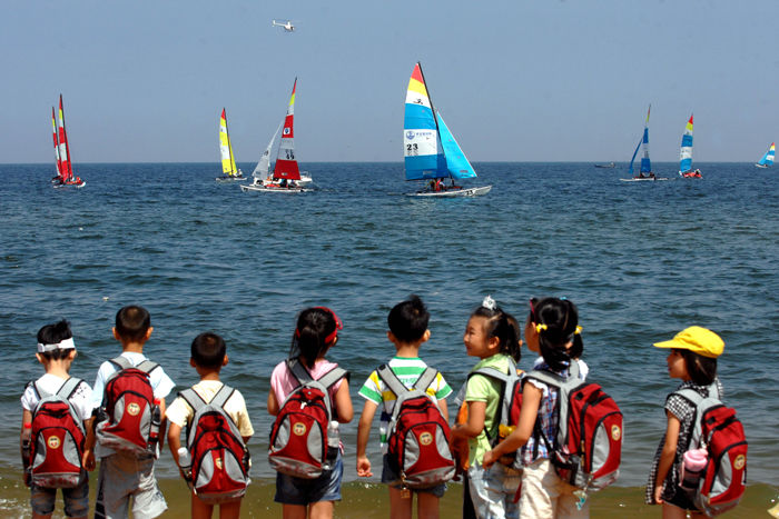 小朋友們在威海市國際海水浴場觀看帆船錦標(biāo)賽 郭緒雷 攝