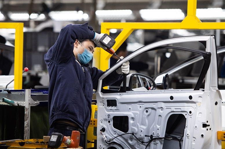 工人在株洲市天元區(qū)北汽株洲二工廠總裝車間裝配車門 陳思汗 攝
