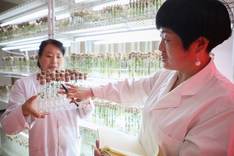 定西市農(nóng)業(yè)科學(xué)研究院科研人員查看馬鈴薯種質(zhì)資源庫(kù)中種質(zhì)脫毒苗生長(zhǎng)情況 馬希平 攝