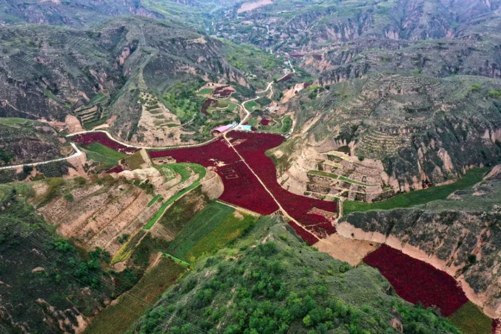 無人機(jī)拍攝的山西省呂梁市柳林縣曹家溝村的掃帚草。在駐村工作隊的帶動下,火紅的掃帚草成為村民就業(yè)增收的“致富草” 詹彥 攝