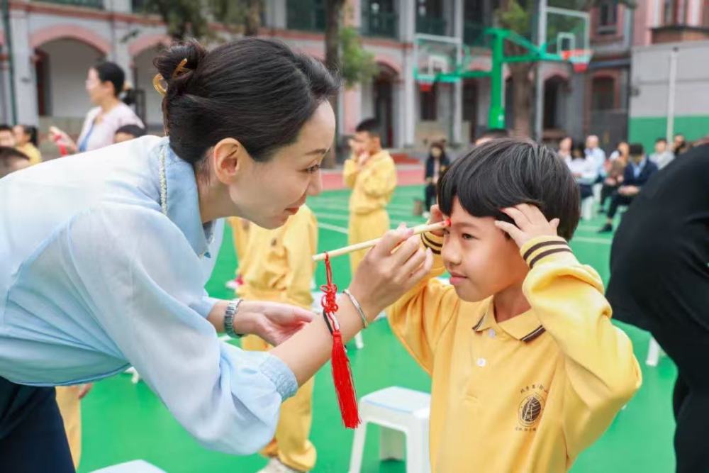 一年級開筆儀式上,何建雯為新生“朱砂啟智”