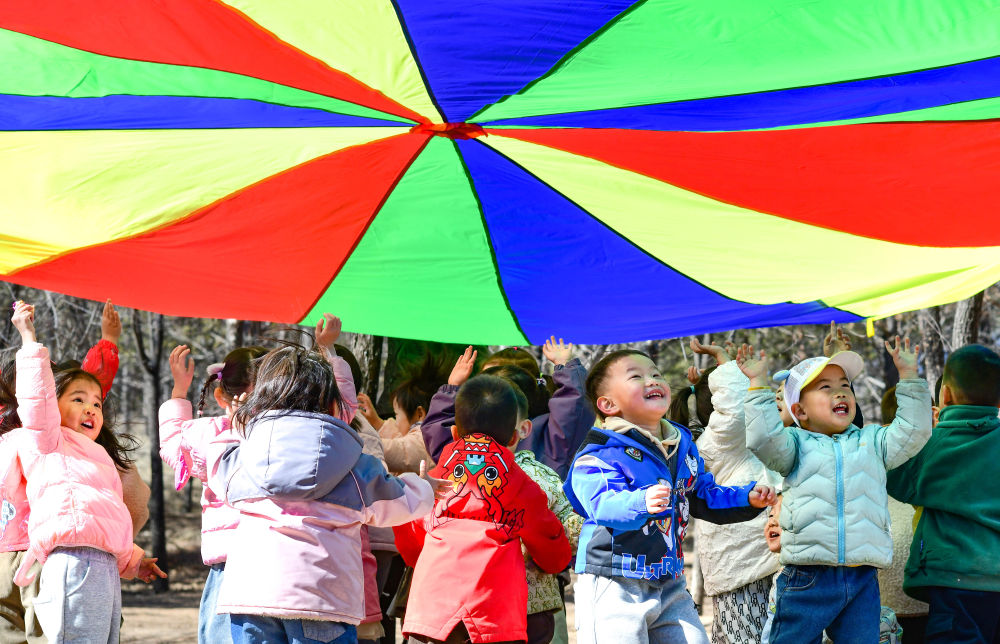孩子們?cè)谕杏龍@里參加空間探索游戲 王正 攝