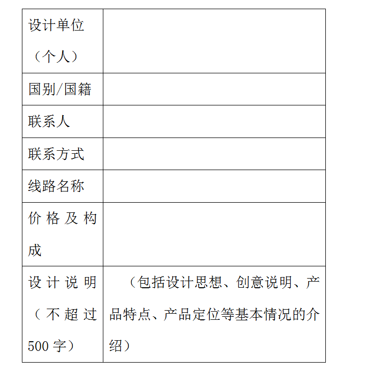 3.參選單位或個(gè)人可通過(guò)電子郵件提交作品。報(bào)送的作品需附500字以內(nèi)設(shè)計(jì)說(shuō)明,對(duì)路線主題、入境方式、國(guó)內(nèi)交通、重點(diǎn)區(qū)域、設(shè)計(jì)理念等做出解釋,并注明設(shè)計(jì)單位、聯(lián)系人及聯(lián)系電話。