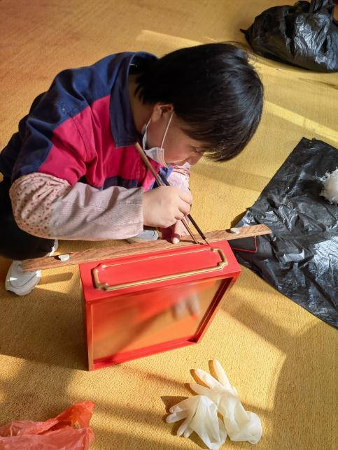 2024年5月27日,申偉達(dá)團(tuán)隊的年輕匠人為紅漆香幾抽屜描金 受訪者供圖